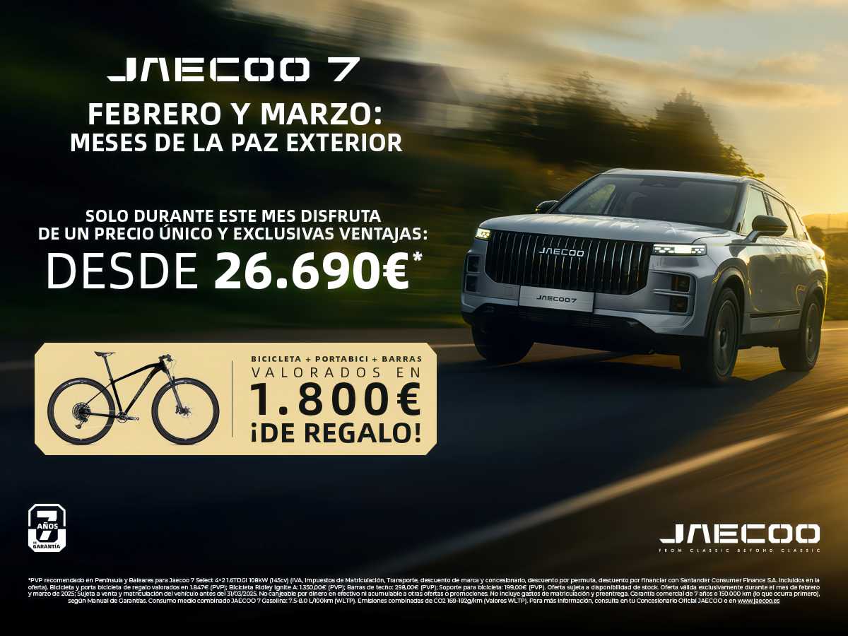 *PVP recomendado en Península y Baleares para Jaecoo 7 Select 4×2 1.6TDGI 108kW (145cv) (IVA, Impuestos de Matriculación, Transporte, descuento de marca y concesionario, descuento por permuta, descuento por financiar con Santander Consumer Finance S.A. incluidos en la oferta). Bicicleta y portabicicleta de regalo valorados en 1.847€ (PVP); Bicleta Ridley Ignite A: 1.350,00€ (PVP); Barras de techo: 298,00€ (PVP); Soporte para bicicleta: 199,00€ (PVP). Oferta sujeta a disponibilidad de stock. Oferta válida exclusivamente durante el mes de febrero y marzo de 2025; Sujeta a venta y matriculación del vehículo antes del 31/03/2025. No canjeable por dinero en efectivo ni acumulable a otras ofertas o promociones. No incluye gastos de matriculación y pre-entrega. Garantía comercial de 7 años o 150.000 km (lo que ocurra primero), según Manual de Garantías. Consumo medio combinado JAECOO 7 Gasolina: 7.5-8.0 L/100km (WLTP). Emisiones combinadas de CO2 169-182g/km (Valores WLTP). Para más información, consulta en tu Concesionario Oficial JAECOO o en www.jaecoo.es